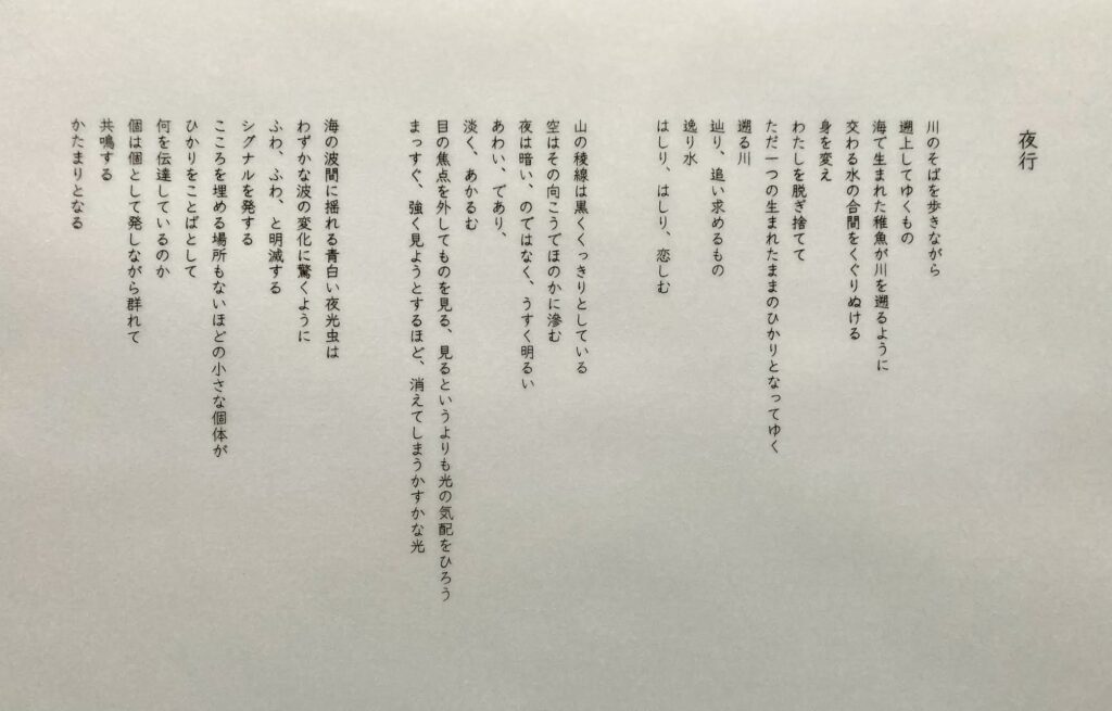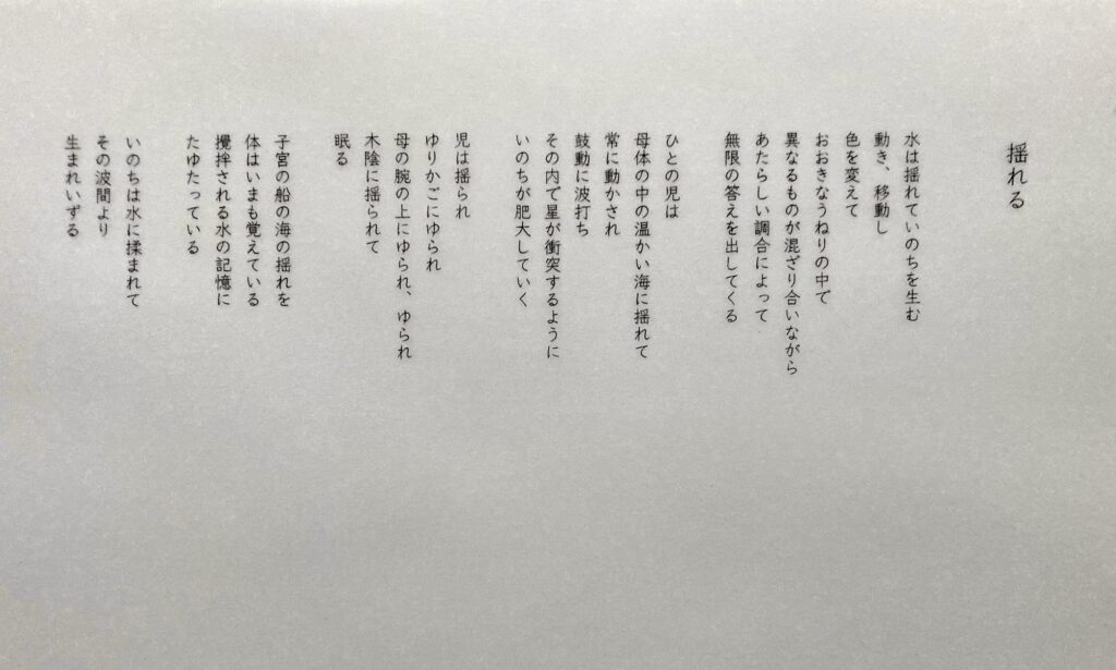 異なる生物や物質が、それぞれの秩序の中で出会うことによって、何か違うものに変化し、旅をして、新しい物語に移行していくことを、幾つかの詩篇とともに作品を構想したといいます。