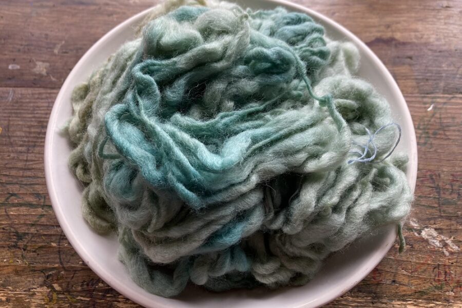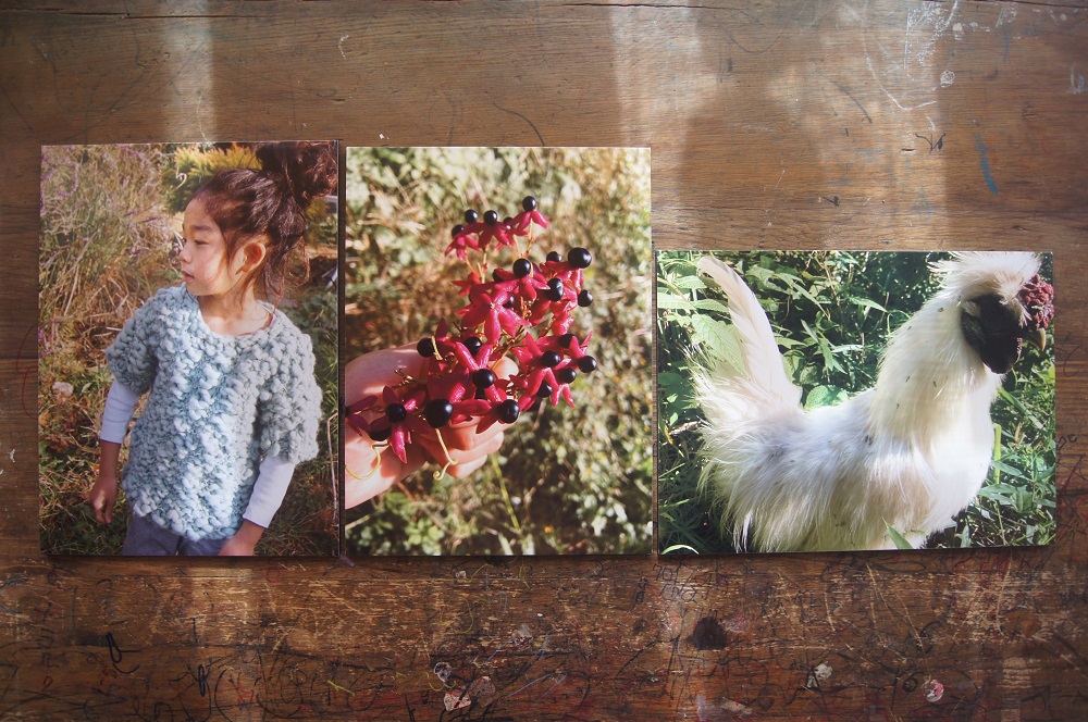 作品は、毛糸以外は主に、自然の中から自分で採集した素材や収集物で作られています。市販で売っている画材ではなく、染料から作成してみることで、物を作ることについて再考したいと思ったからだそう。