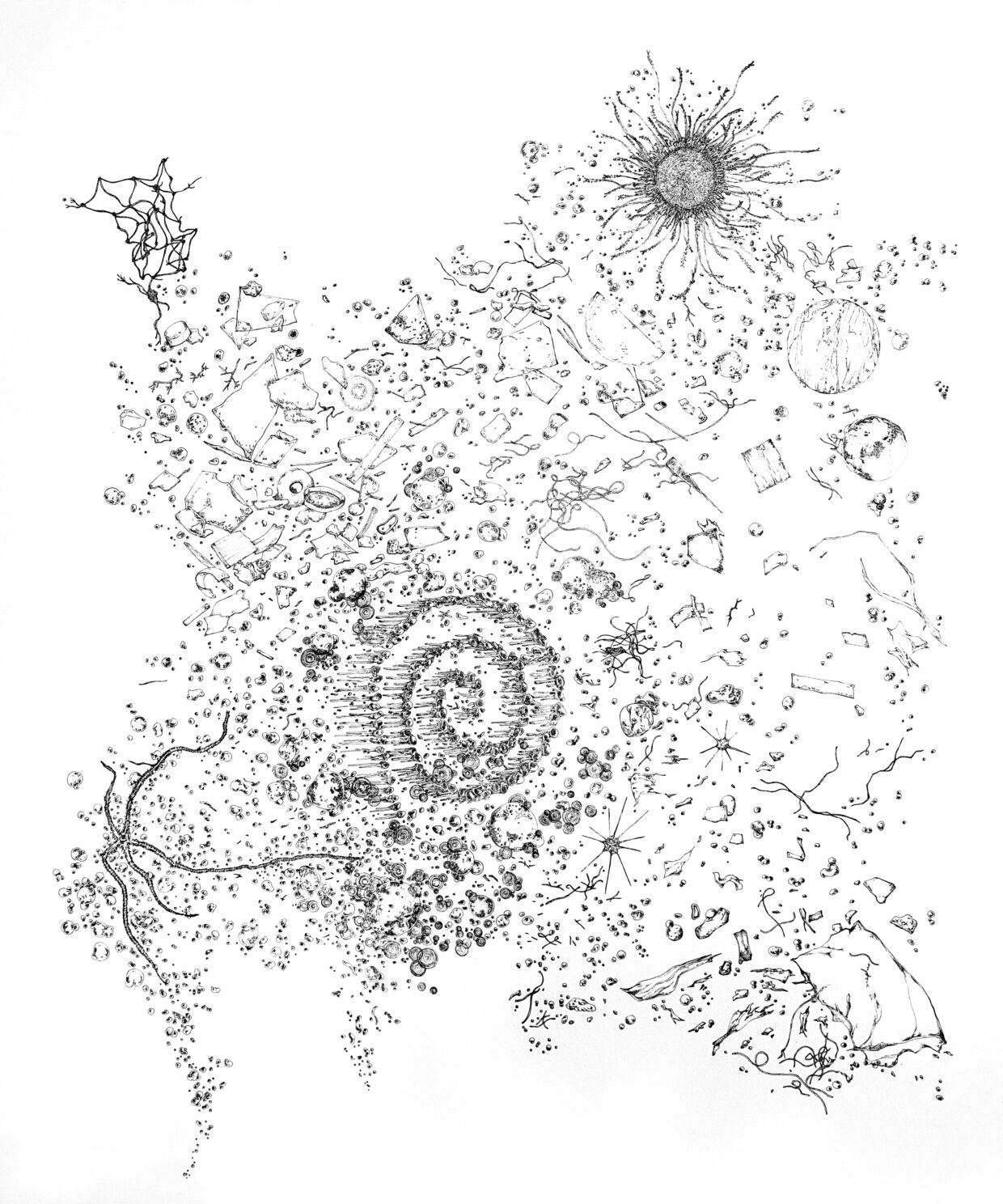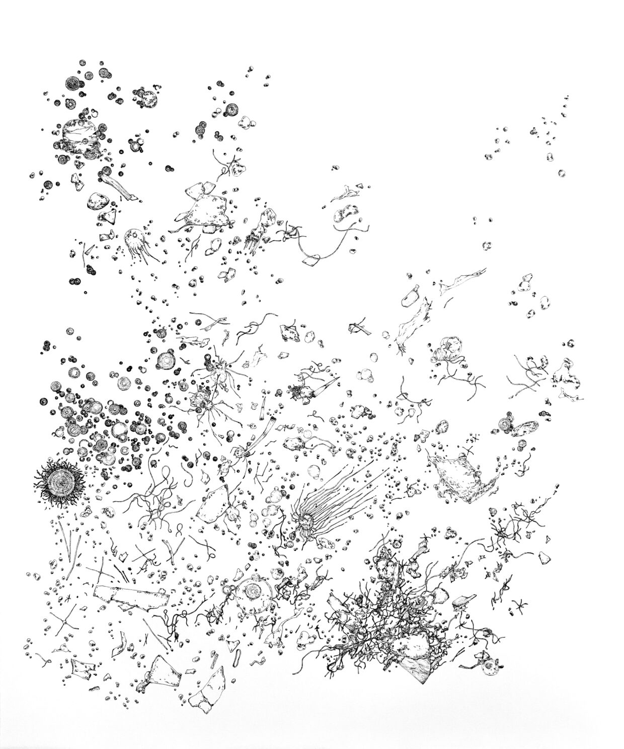 「それがすごく印象的で。これまでイカや魚など、目に見える海の生きものを描いてきたけれど、見えないものも描きたくなったんです」見えないものの中に、見逃せない問題がある。