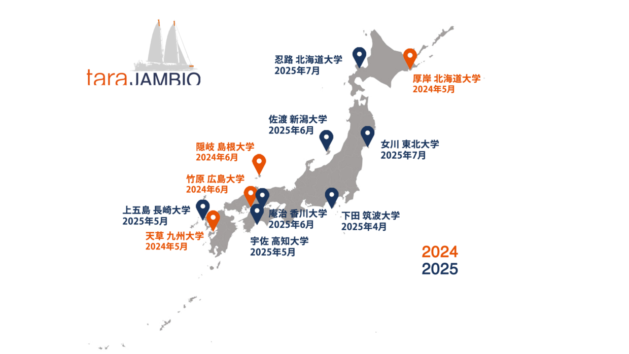 Tara JAMBIOはブルーカーボン生態系の実態と炭素循環の仕組みを理解するため 海藻・海草などを対象にした調査・研究を最低 3 年間行います。実地調査は、海藻の多くが芽吹く春の期間(4 月~6 月頃まで)に全国 11 か所以上で行います。結果は科学論文で発表し、データをオープンデータとして公開します。