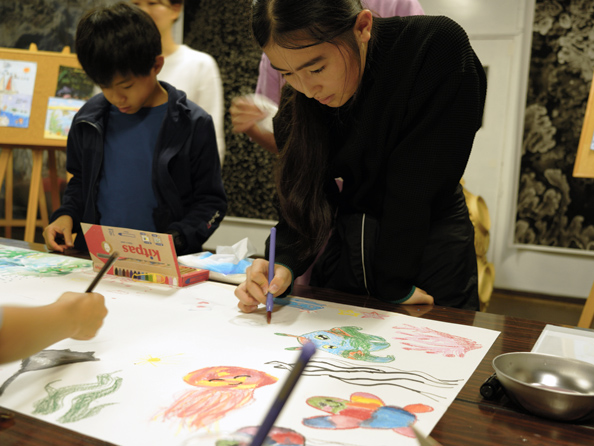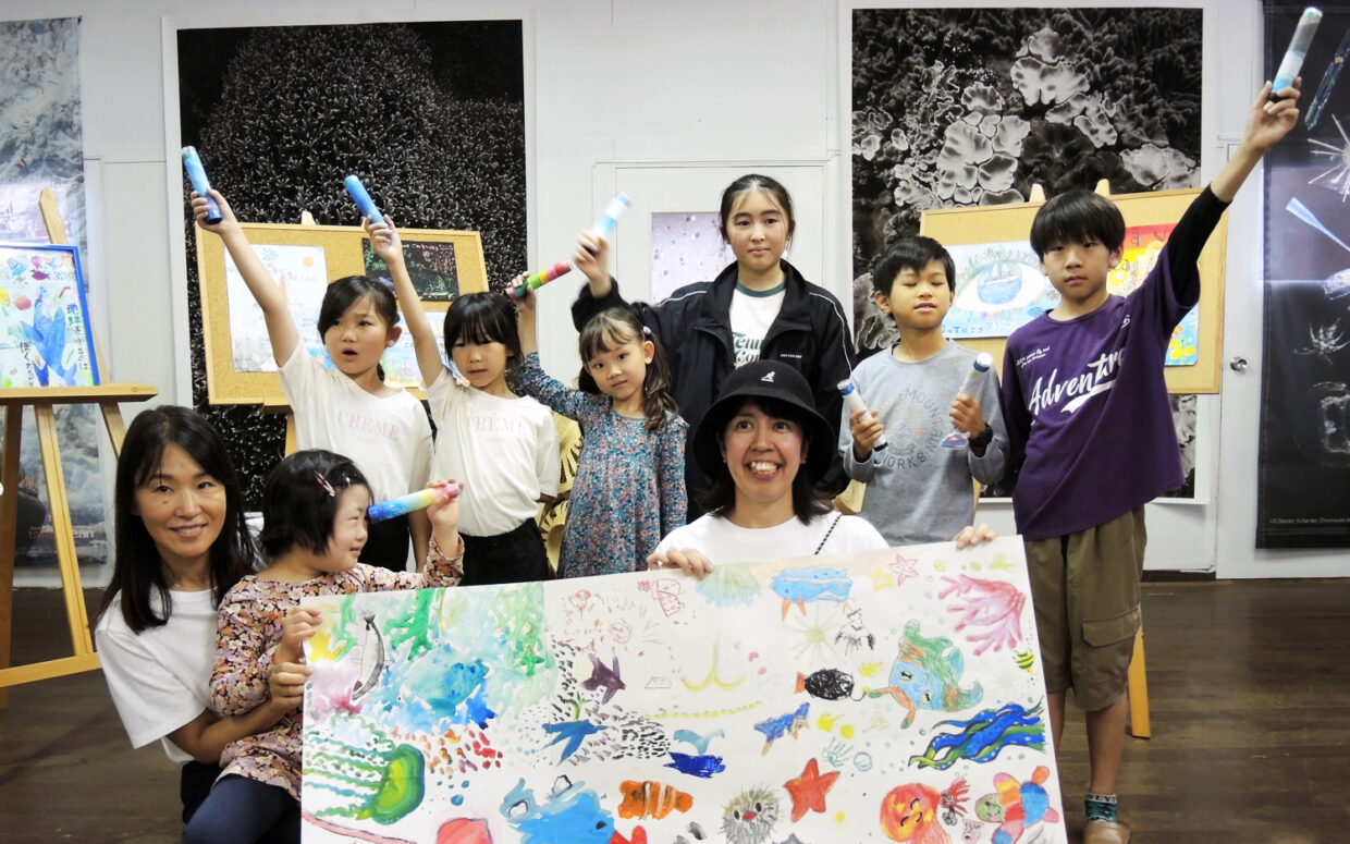 室内に戻ったあとは、イラストレーター花咲マリサさん主導の元、子どもも大人も一緒に大切な海の生き物をテーマにした共同アートを制作。皆で描いたことで、温かい一体感が生まれました。