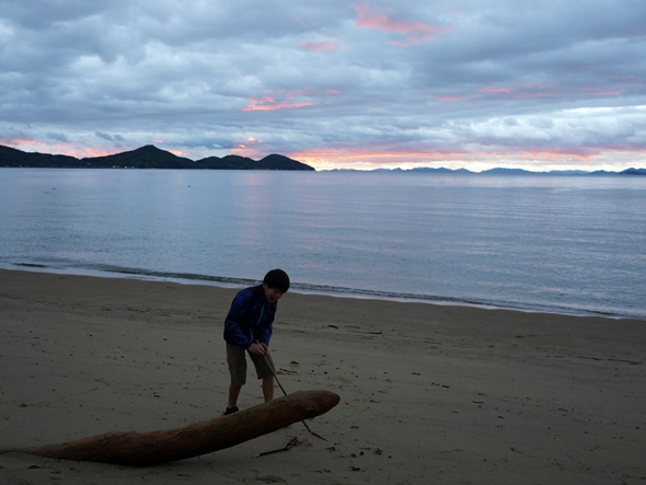雨が止んだ後には、美しい夕日スポットの西浜で翌日使う万華鏡の素材集め。厚い雲の切れ間から、ほんの一瞬だけ顔を見せた夕焼けも楽しむことができました