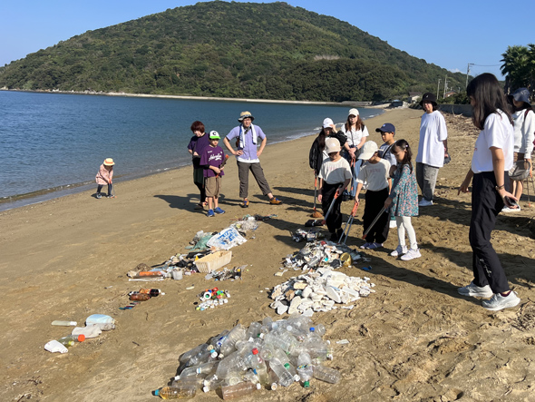 2日目は快晴の中、西浜でのビーチクリーンからスタート。前日に大きなごみをたくさん見ていたのでみんなのやる気がみなぎっていました。ビーチクリーンで集めたごみにはどんなものがあるかを観察し、その多くがプラスチックゴミであり、そのほとんどが私たちが日常的に使っているものである事を目の当たりにしました。
