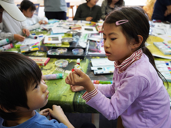 この講堂は普段タラ オセアン関連のアート作品を展示している場所で、瀬戸内国際芸術祭2025に向けて今年リニューアルされたばかり。アート作品に囲まれ、子どもたちも保護者の皆さんも興味津々でした。空き時間には、ほかの展示作品も鑑賞できました。
