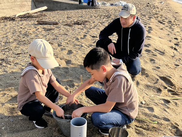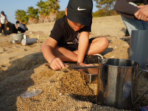 ビーチクリーンの後には、タラ オセアンの科学者が行う調査とほぼ同じ方法でマイクロプラスチック採集も体験。みんなで見た夕日がとても綺麗でした!