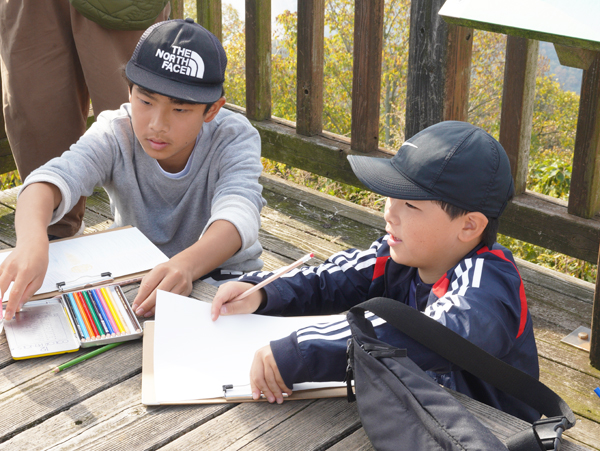 2日目の朝は山登りからスタート。天気が良いと瀬戸内の多島美を堪能できる城ノ山ですが、この日はあいにくのお天気。それでも山頂で食べる地元のみかんはとてもおいしく、子ども達のみかんへの情熱が露わとなりました。山頂では、スケッチも。