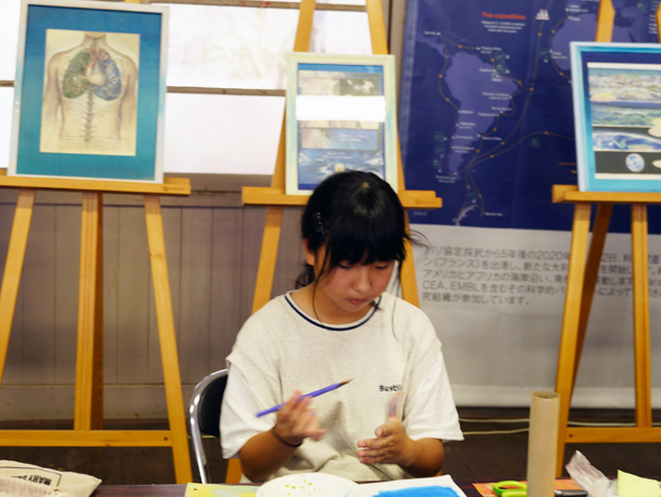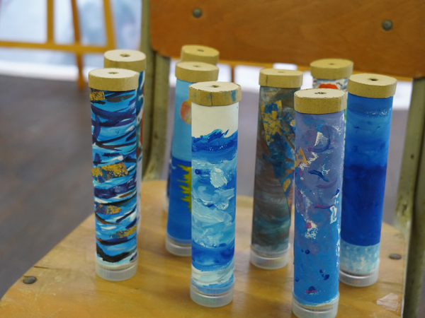 下山してからは、いよいよ粟島の思い出アート制作。日本画家の彩蘭弥さんを講師にお迎えし、万華鏡を作りました。外側のデザインは粟島をテーマにそれぞれが描いたもの。万華鏡になるパーツは西浜で集めたマイクロプラスチックや貝殻。粟島の思い出が詰まっています。
