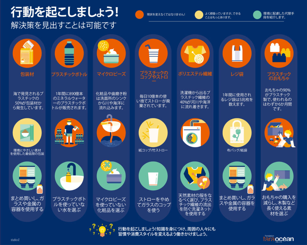 タラ オセアン ジャパンはJAMBIO (マリンバイオ共同推進機構) と共同でマイクロプラスチックの調査、研究を行っています。また、マイクロプラスチックの問題の解決にはプラスチックの消費量を減らすことが欠かせないとお伝えしています。