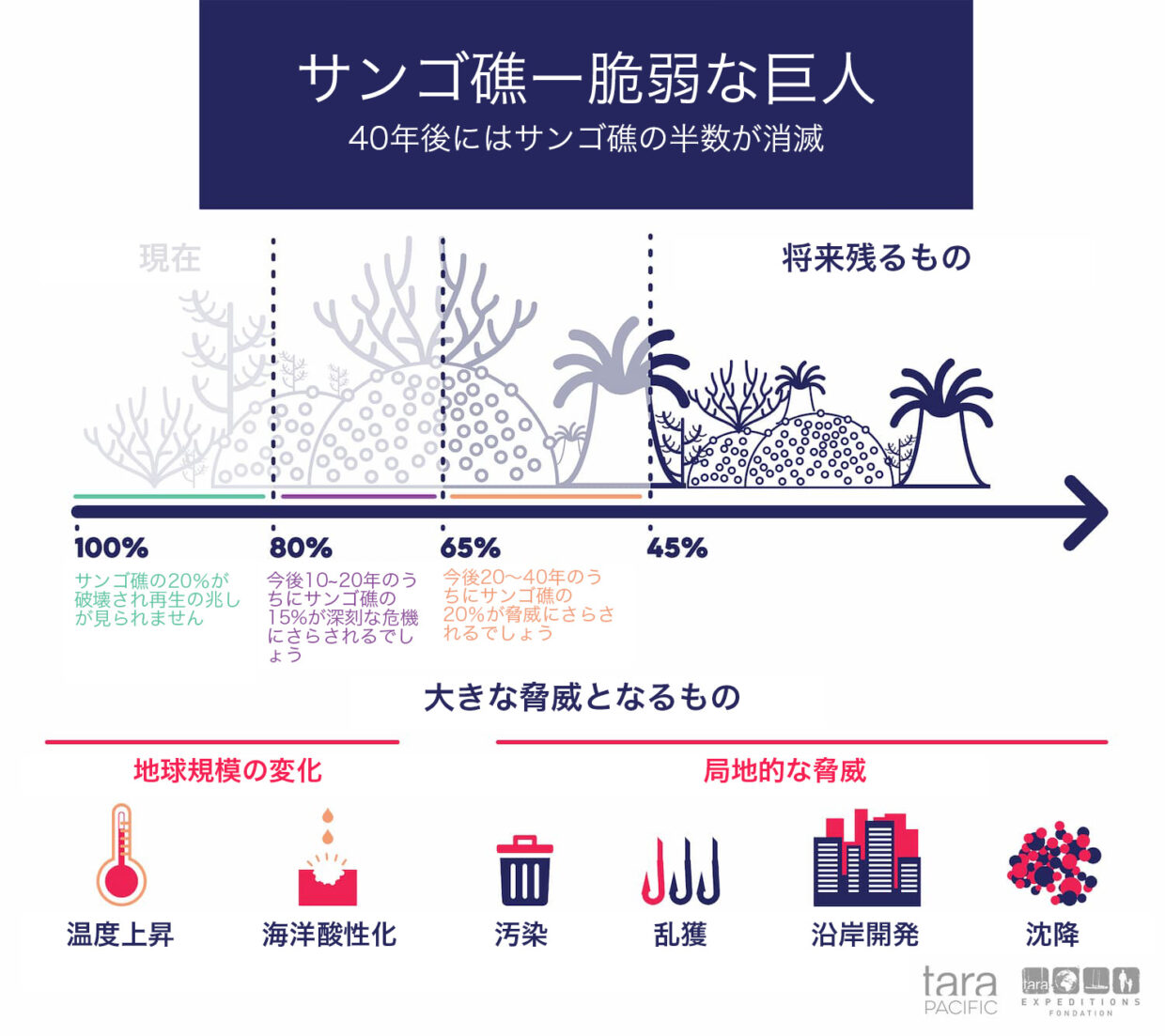 地域によっては、過去30年間でサンゴの50%がすでに失われたと推定されています。そして、今のペースで地球温暖化が進めば、今世紀末までにほとんどのサンゴ礁が消滅すると見込まれています。IPCC(気候変動に関する政府間パネル)の報告によれば、地球の平均気温が2℃上昇すると、熱帯のサンゴ礁の99%以上が消滅する可能性があるとされています。